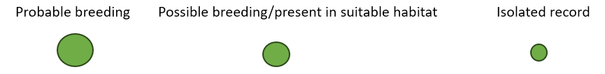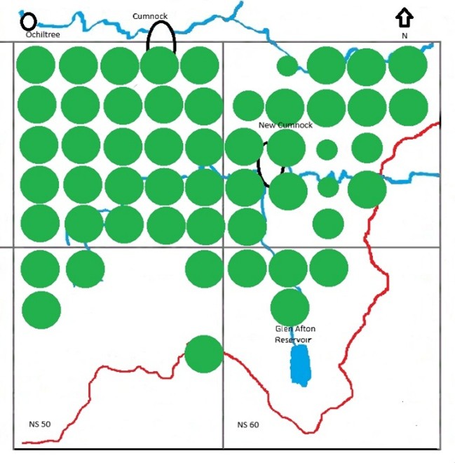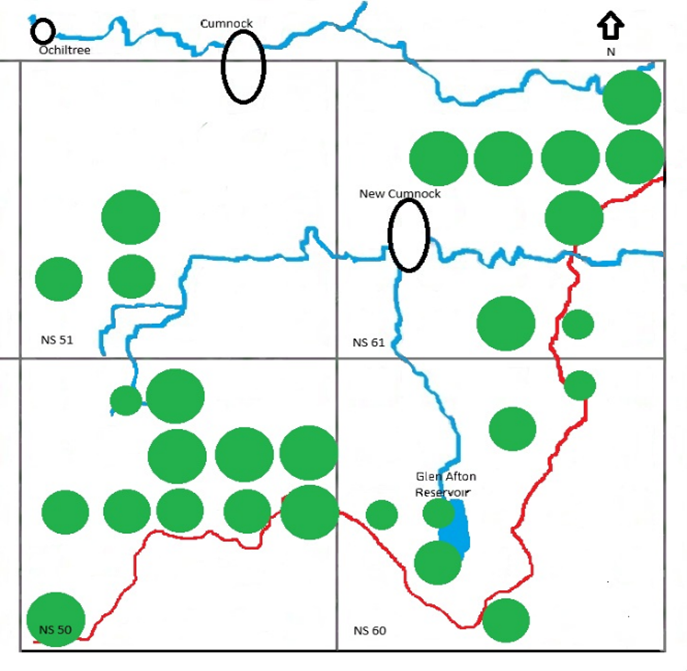 To illustrate the changes that have taken place in the New Cumnock area over the last 14 years, I concentrate here on upland species which have seen serious declines. The examples I have chosen for breeding distribution mapping are Red Grouse, Black Grouse, Lapwing, Golden Plover and Redshank. Sufficient data exists for these species to produce the following maps. Large green dots represent probable breeding, medium dots possible breeding/present in suitable habitat. and small dots represent a single isolated record. These dots are placed within 2km terads.